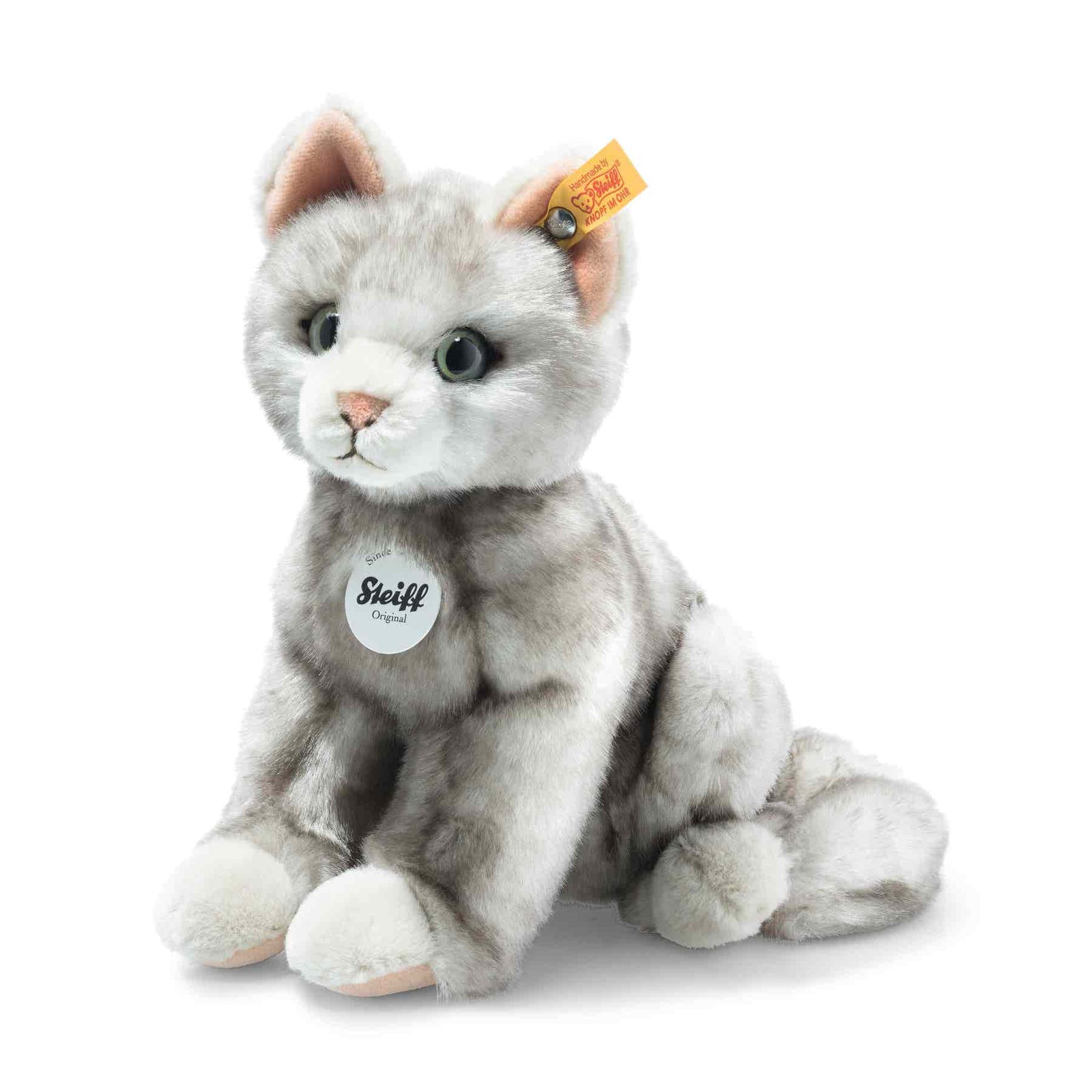 Her smooth, elegant grey coat is made of fluffy tipped plush, while the pink on her ears and nose provides a gentle contrast. Her white snout and white paws add to her charm, and the airbrushing on her mouth, nose, ears and corners of the eyes complete the detailed design.